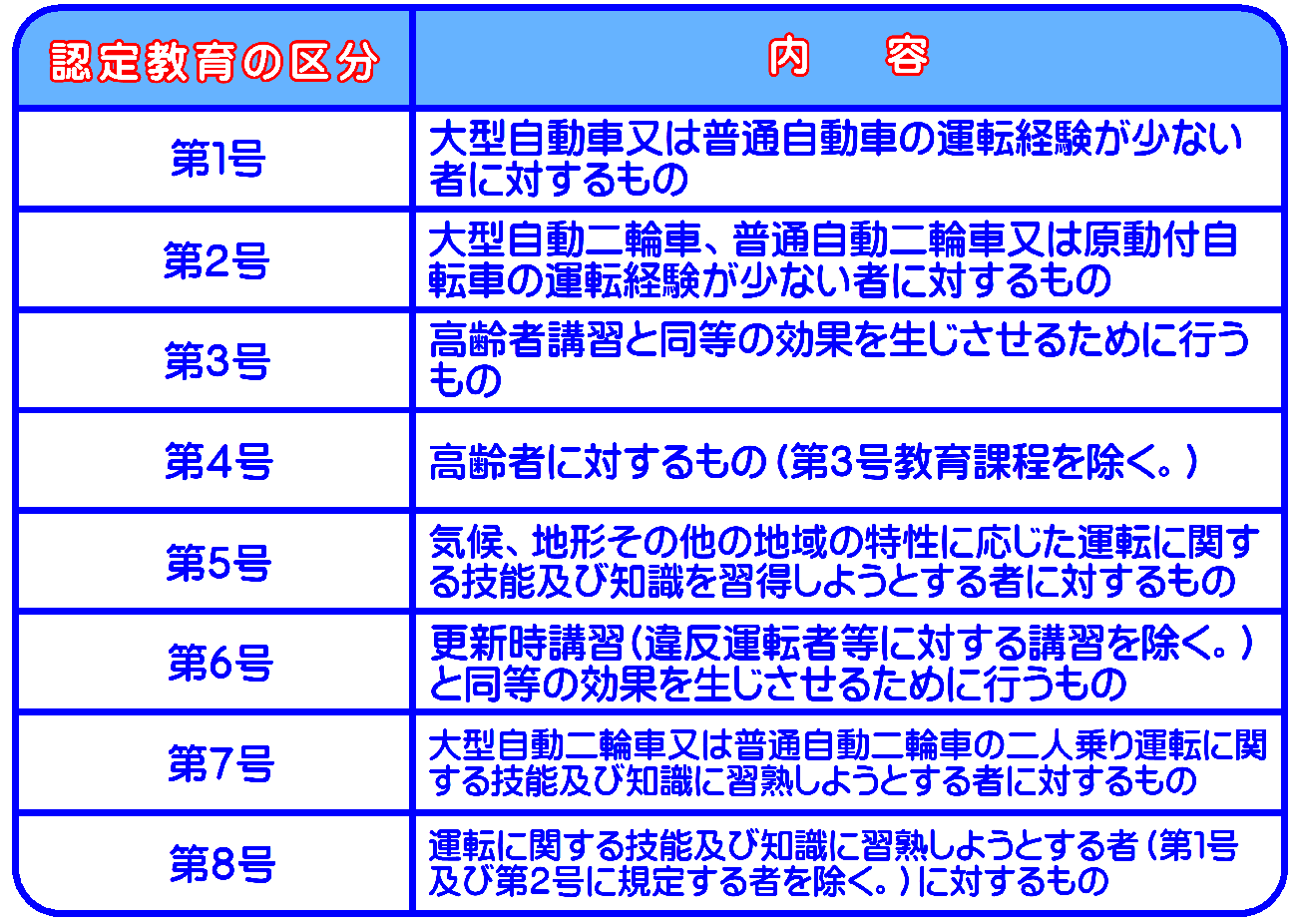 この教育は、日頃運転する機会が少ないいわゆるペ-パ-ドライバ-、あるいは運転技能や安全運転知識をさらに向上させたいと希望される方に対するものですが、第3号教育課程と第6号教育課程を終了された方は、更新時講習が免除されます。