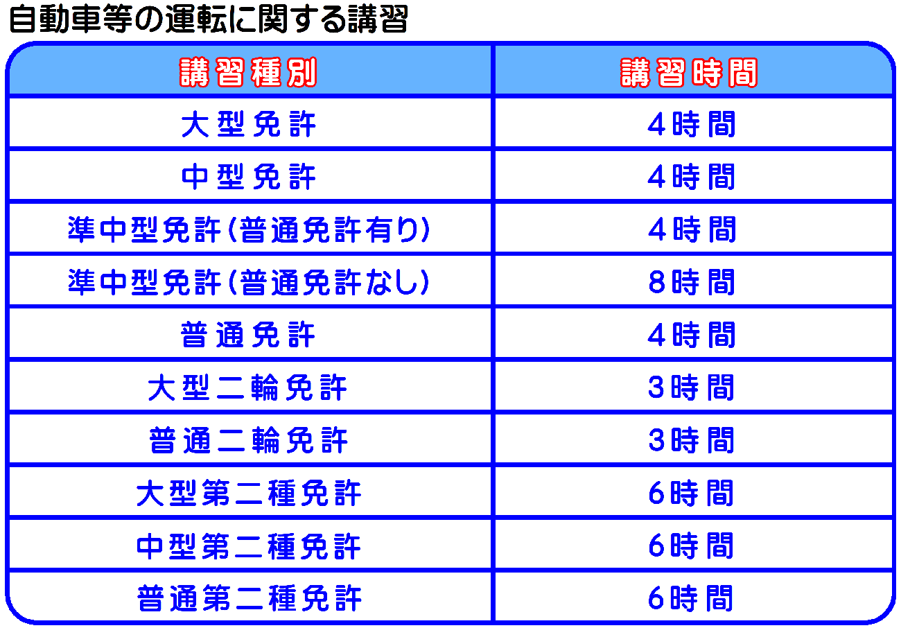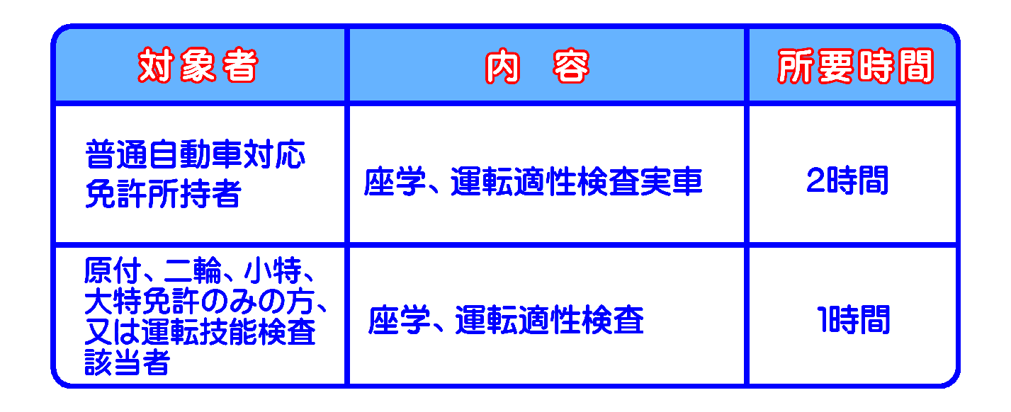この講習は、自動車等の運転に関する講習と応急救護処置に関する講習があります。指定自動車教習所(自動車学校)で教習を受けて技能検定に合格した方は、この講習を受講する必要はありません。